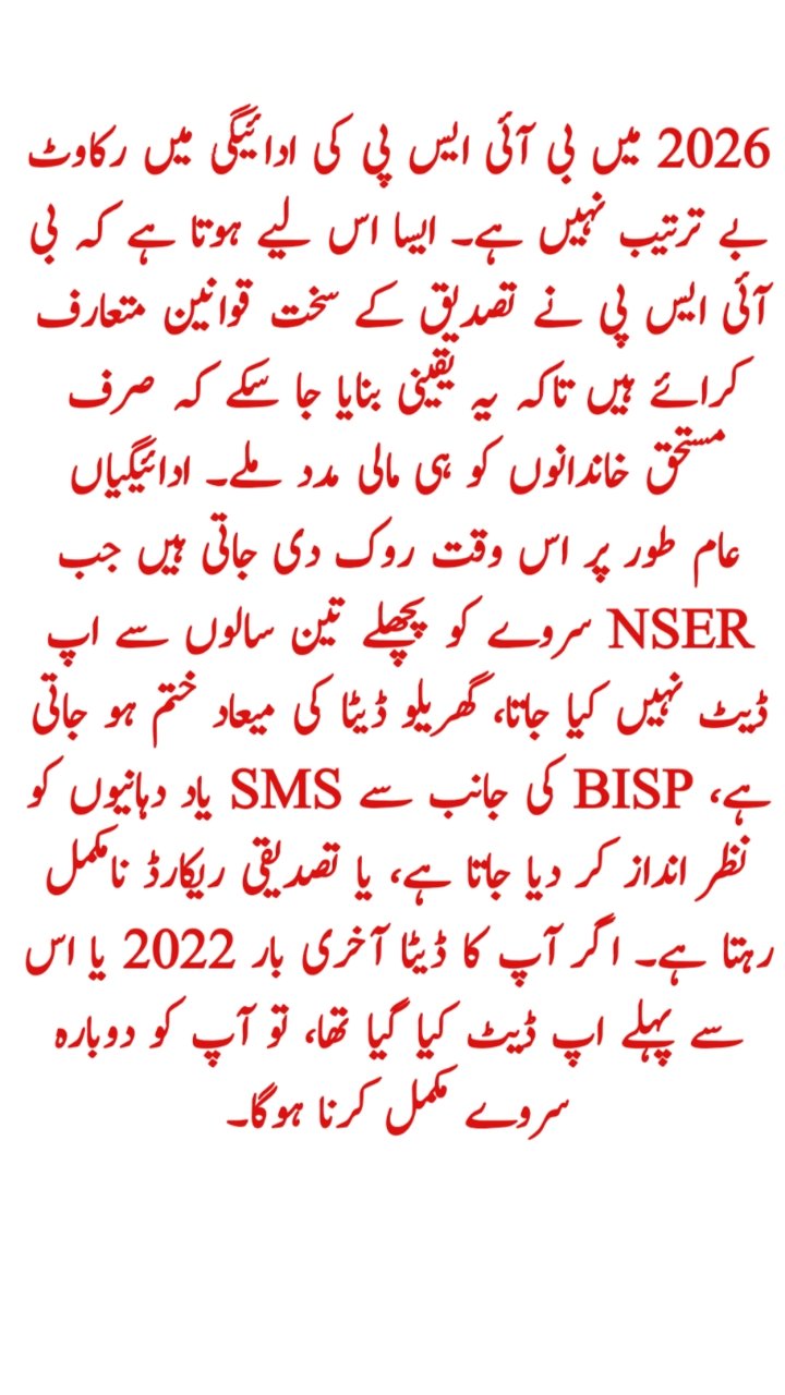 The BISP payment blockage in 2026 is not random. It happens because BISP has introduced strict verification rules to ensure that only deserving families receive financial support. Payments are usually stopped when the NSER survey is not updated for the last three years, household data becomes expired, SMS reminders from BISP are ignored, or verification records remain incomplete. If your data was last updated in 2022 or earlier, you must complete the survey again.