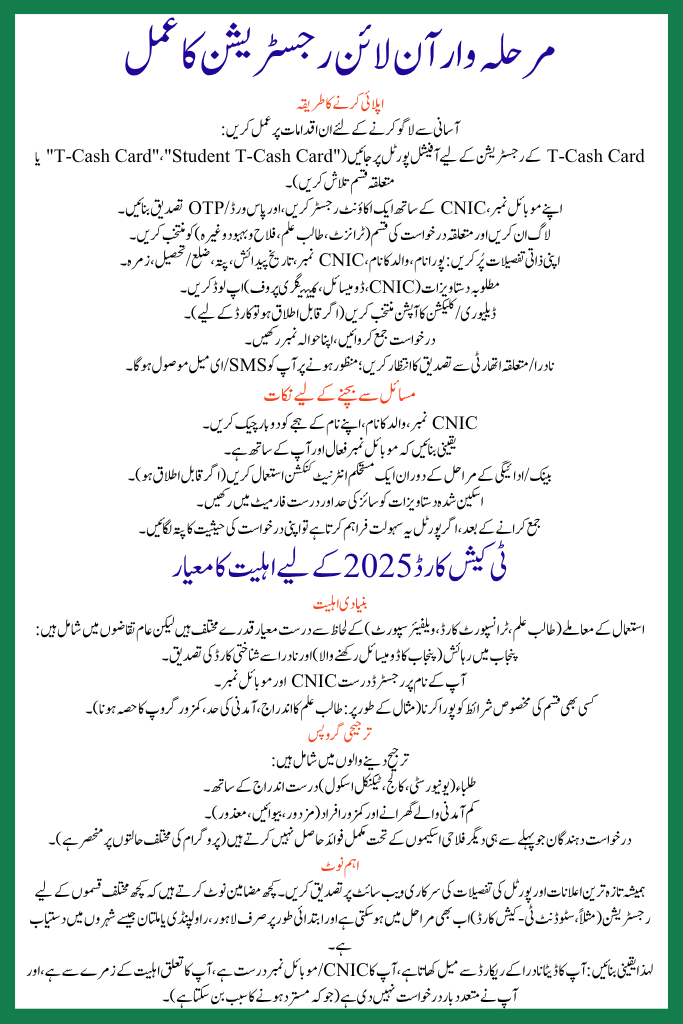Always verify the latest announcements and portal details on the official website. Some articles note that registration for certain variants (e.g., student T-Cash card) may still be in phases and available initially only in cities like Lahore, Rawalpindi or Multan.