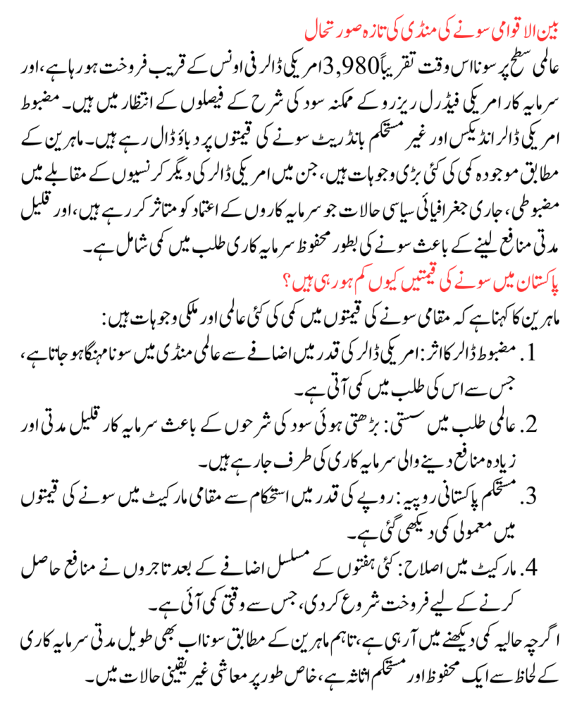 Experts say multiple global and domestic factors are influencing the decline in local gold rates. 1. Stronger Dollar Effect: A robust US dollar makes gold more expensive internationally, lowering demand. 2. Slower Global Demand: Many investors are moving to short-term, high-yield assets as interest rates rise. 3. Stable Pakistani Rupee: A steadier exchange rate has slightly eased domestic gold prices. 4. Market Correction: After weeks of price gains, traders are cashing in profits, triggering short-term corrections. Despite this dip, analysts maintain that gold remains a solid long-term investment, particularly during periods of economic instability.