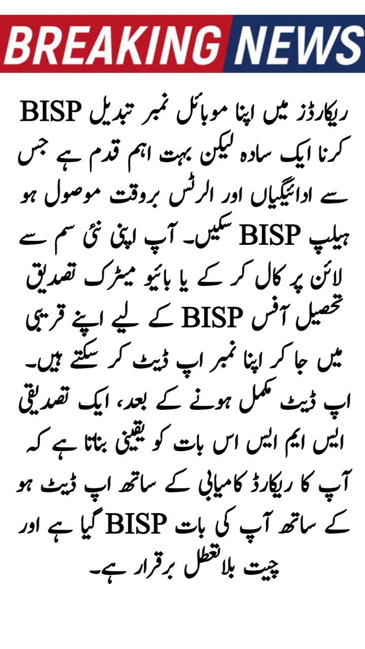Changing your mobile number in BISP records is a simple but very important step to receive payments and alerts on time. You can update your number either by calling the BISP helpline from your new SIM or by visiting your nearest BISP Tehsil Office for biometric verification. Once the update is completed, a confirmation SMS ensures that your record has been successfully updated and your communication with BISP remains uninterrupted.