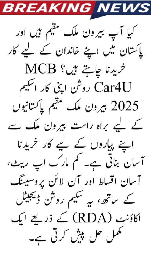 Are you living abroad and wish to buy a car for your family in Pakistan? The MCB Car4U Roshan Apni Car Scheme 2025 makes it easy for overseas Pakistanis to purchase a car for their loved ones directly from abroad. With low markup rates, easy installments, and online processing, this scheme offers a complete solution through the Roshan Digital Account (RDA).