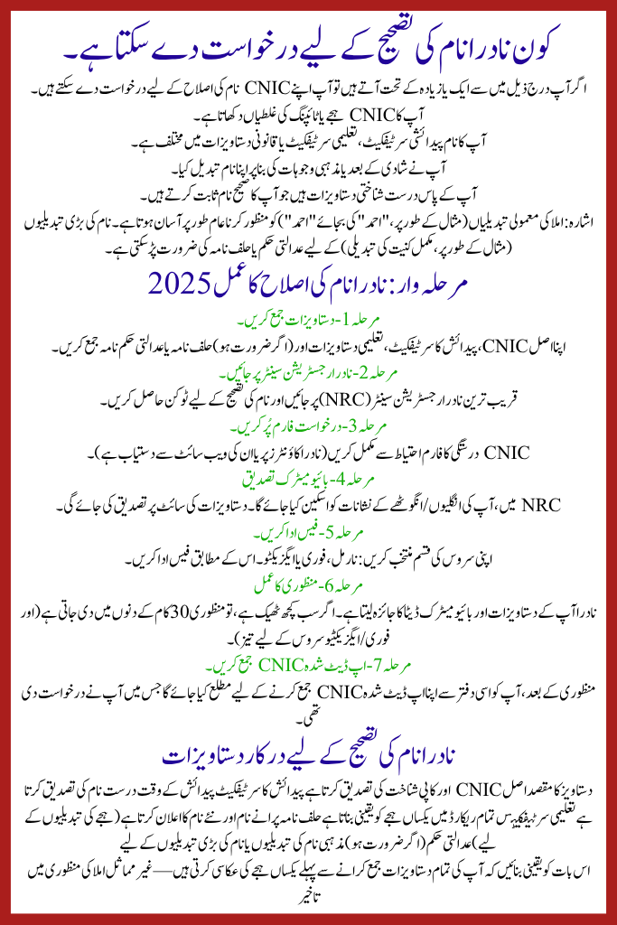 | NADRA CNIC Name Correction Process 2025 | Ongoing (2025) | Until further notice | Normal service starts around Rs. 400+ (exact fee subject to NADRA policy) | In-person at NADRA Registration Centre |