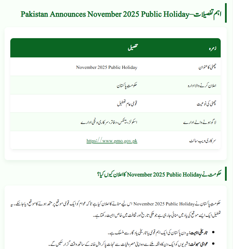 The government declared the Pakistan November 2025 Public Holiday to commemorate an important national occasion and promote unity among citizens.