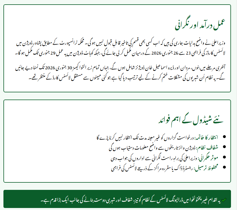 According to an official statement, the KP Transport Department has released a comprehensive division-wise and district-based schedule. The Chief Minister has strictly instructed all concerned departments to adhere to this timeline to ensure that every citizen receives their license card within the month of January 2026.