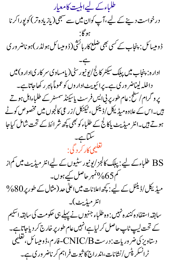 Must be student cutting-edge a public sector college/college in Punjab, have Punjab domicile, meet the least academic standards (e.g. 65% in middle for BS), not have helped after a previous govt laptop scheme.