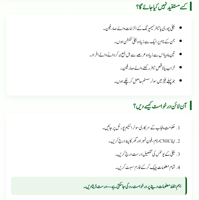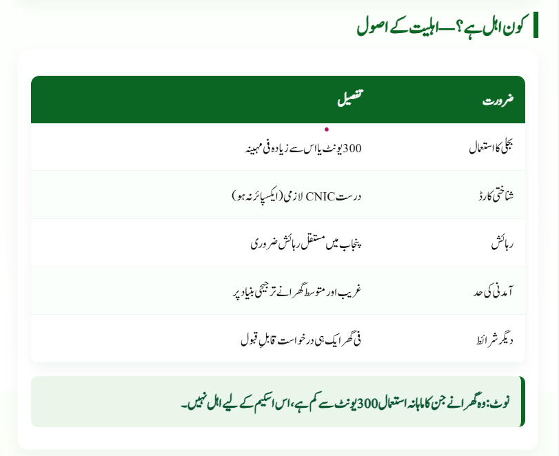 Families living in Punjab who use 300 or more electricity units per month and hold a valid CNIC can apply for the scheme.