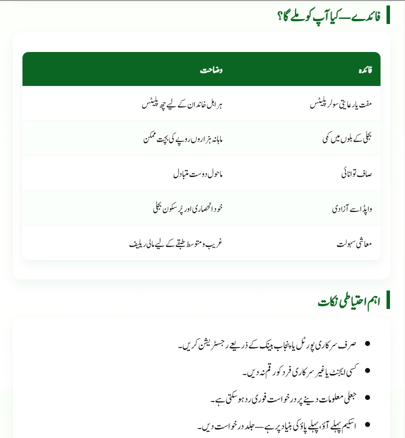 The Punjab Solar Panel Scheme is a historic and visionary step by the Punjab Government to solve one of the country’s biggest problems — expensive electricity. By offering six free solar panels per family, the initiative ensures that every eligible household can enjoy a reliable power supply while saving money. This program will not only empower citizens but also promote Pakistan’s journey toward a greener and more self-reliant energy future. If your family uses 300 or more electricity units per month, this is your golden opportunity. Apply now and bring light, savings, and sustainability to your home.
